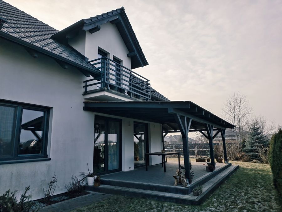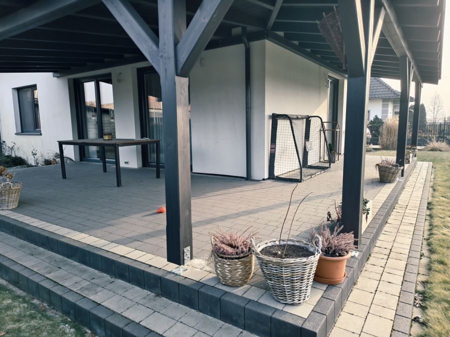 Dach pokryty dachówką Braas Rubin 9V w kolorze antracytowym. Zadaszony taras wykończony kostką brukową.